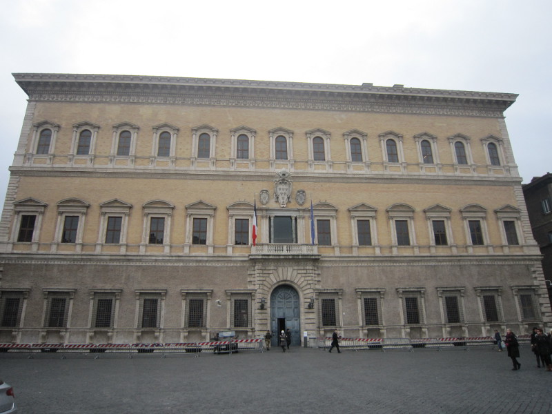 Enfin, il nous fallait finir notre achever notre séjour par les ultimes Michel-Ange facilement accessible. Dans l’église de la Minerve, on trouve une statue du Christ rédempteur. Alors que nous contemplions cette très belle œuvre, l’organiste a commencé à jouer une toccata de Bach. L’effet était saisissant et la musique s’accordait parfaitement à la puissance qui se dégageait de la statue. Nous avons quitté la Minerve quand ce concert impromptu s’est tu pour aller voir le palais Farnèse. Commencé par Antonio da Sangallo le Jeune pour le cardinal Alexandre Farnèse, la résidence est achevée par Michel-Ange pour le même, devenu le pape Paul III. L’architecte florentin a su créer une dynamique verticale très prononcée par l’adjonction de la loggia au centre du piano nobile. La corniche, très imposante, semble étendre sa protection sur le quartier voisin. Aujourd’hui siège de l’ambassade de France et de l’École française de Rome, cet extraordinaire palais est loué par notre pays pour un euro symbolique.