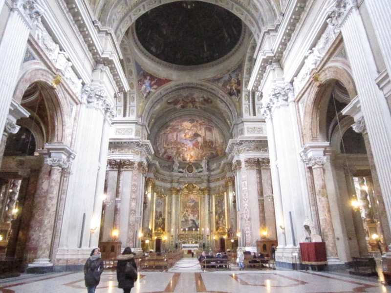 Notre groupe s’est ensuite dirigé vers l’église San Ignazio. Sise sur une petite place en forme de théâtre, le bâtiment est connu pour les merveilleux trompe-l’œil du père Pozzo. L’émerveillement était au rendez-vous surtout devant celui de la coupole. Puis nous avons gagné le Panthéon. Beaucoup l’avait déjà vu mardi soir mais nous avons pu en faire une visite plus approfondie. La voûte antique et son oculus ont retenu l’attention de nos visiteurs de même que la tombe de Raphaël.